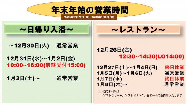 年末年始の営業時間をお知らせします 2025/12/25 年末年始の営業時間をお知らせいたします。12月27日(土)よりおよそ1週間程、ご不便をおかけいたしますがご了承ください。 <<戻る - Powered by PHP工房 -